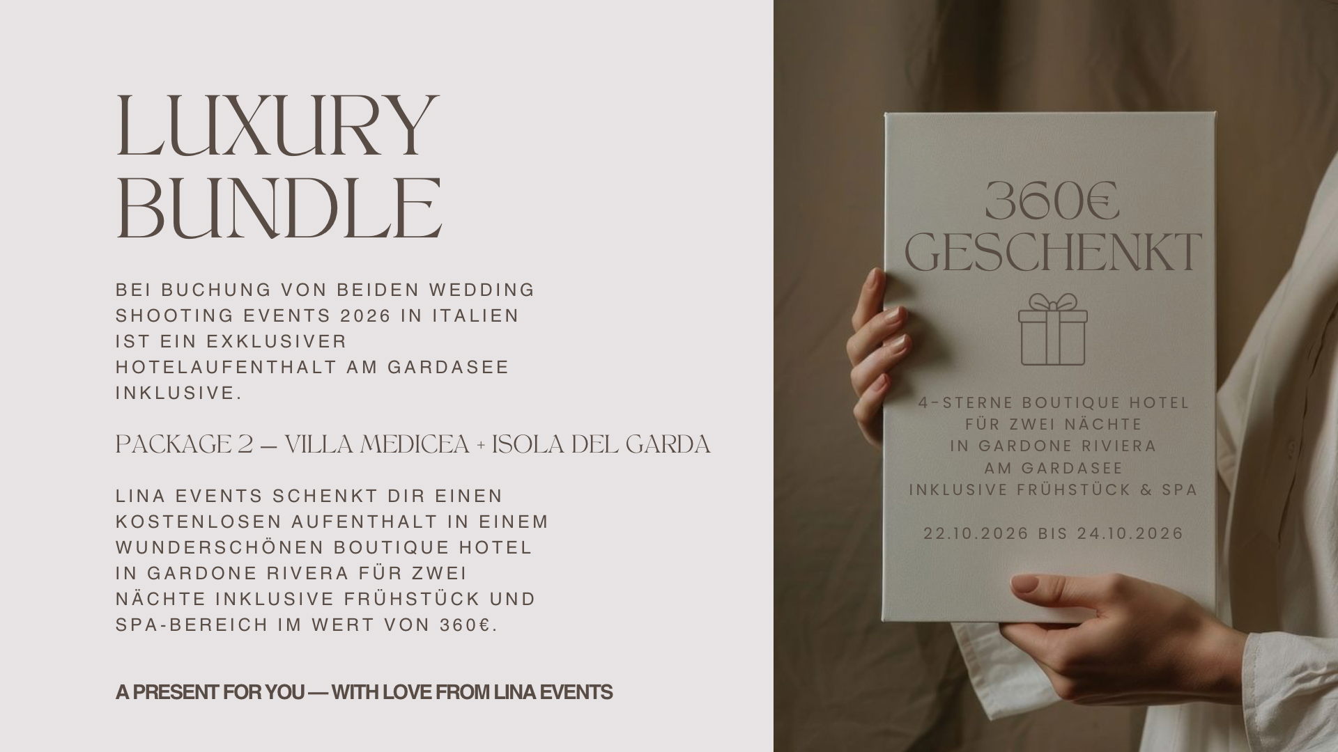 Du möchtest für 2026 beide Wedding Shooting Events von LINA Events buchen? Dann haben wir uns etwas ganz besonderes für Dich überlegt.
